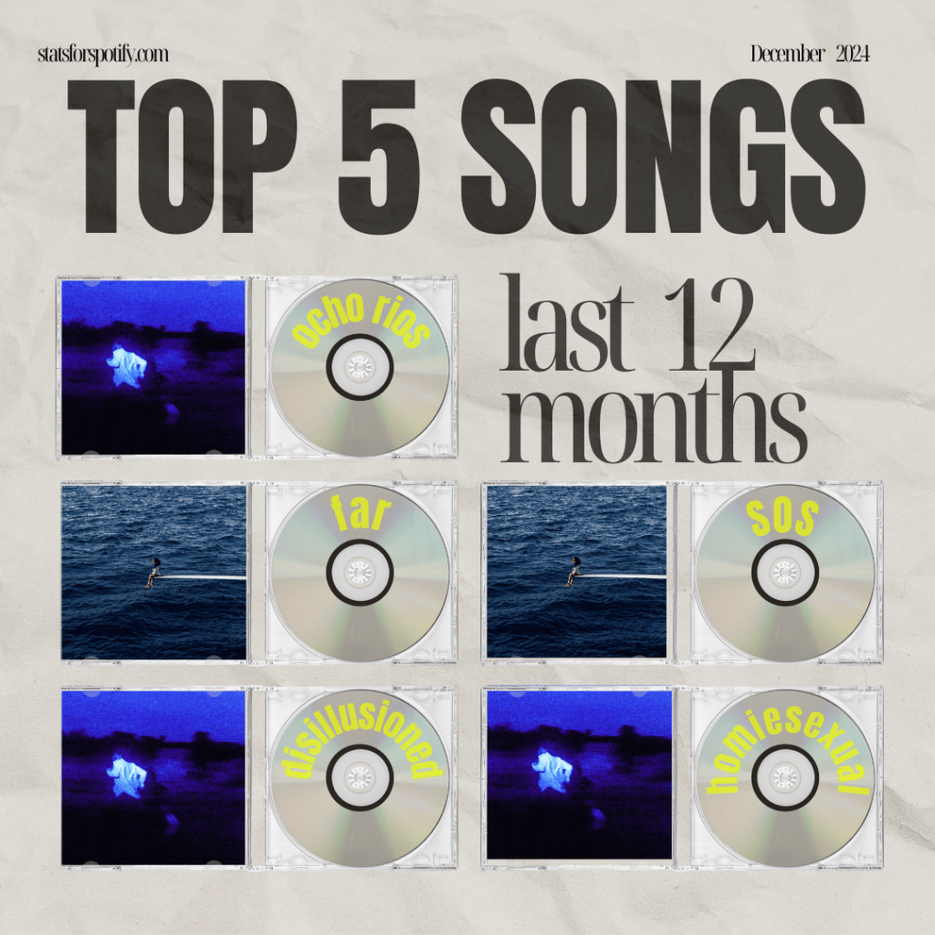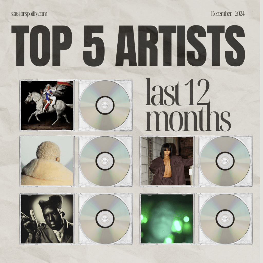 In hindsight, I had the most to say about 4 of these artists in my Weekly Flows. Each of their projects that were released this year resonated in some way with me and I had them on repeat for some period of time, heavy. Generally, I’m not disputing this, but the one outlier for me is Beyonce. I don’t think I listened to Beyonce nearly as much as my other top artists this year, nor did I particularly care for Cowboy Carter. And, in my top songs list, not a single Beyonce song even made the top 20, so I’m a bit confused on that placement. I would’ve expected Sabrina Carpenter, Daniel Caesar, Tyler, The Creator or SZA to have obtained that fifth spot as many of their songs landed in my top songs list and were frequently played.