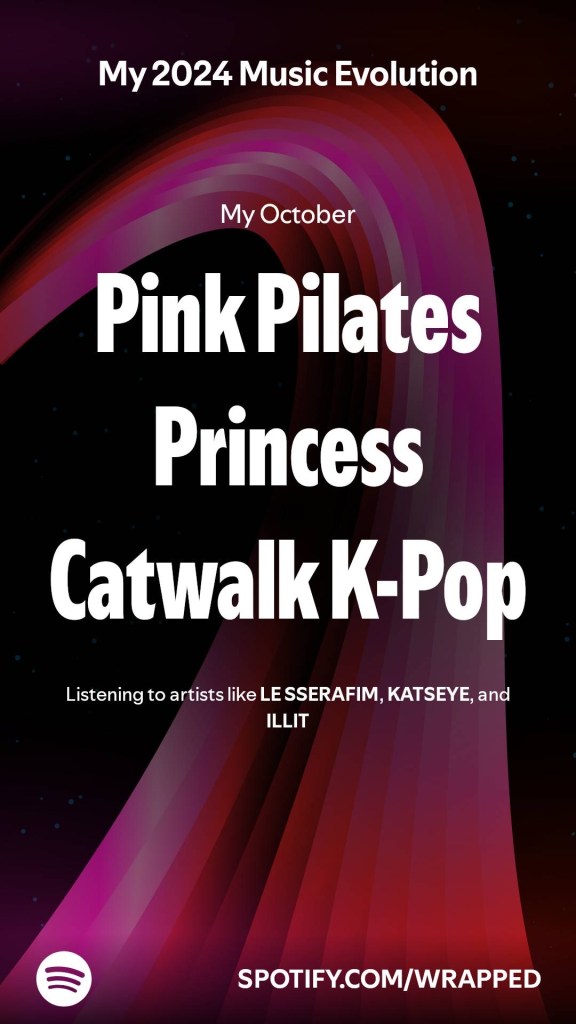 - October – “Pink Pilates Princess Catwalk K-Pop”: Did every queer person get some version of “Pink Pilates Princess”? Seems like a generalization if I ever recognized one! At least they had the decency to recognize the K-Pop wave that I’ve been leaning into within the last quarter of the year. KATSEYE, LSSERAFIM, and ILLIT were the 3 artists mentioned for this categorization, which is accurate I guess.. Seeing on social media that a lot of other pop music listeners also got “Pink Pilates Princess” is throwing me though. Again, lazy of Spotify for this classification!