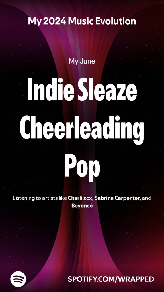 - June – “Indie Sleaze Cheerleading Pop”: this one kills me because I would not consider Indie Sleaze and Cheerleading Pop to be adjacent genres. Artists like Charli XCX, Sabrina Carpenter and Beyonce are ones that Spotify mentioned for this genre– Indie Sleaze though? Feels like a reach. I heavily leaned into my “alt girl” Spotify playlist this summer, listened to a lot of Steve Lacy, while also heavily listening to the Pop girls in preparation for Lollapalooza. I kind of am picking up on where they were going with this, but it feels like a lazy classification.